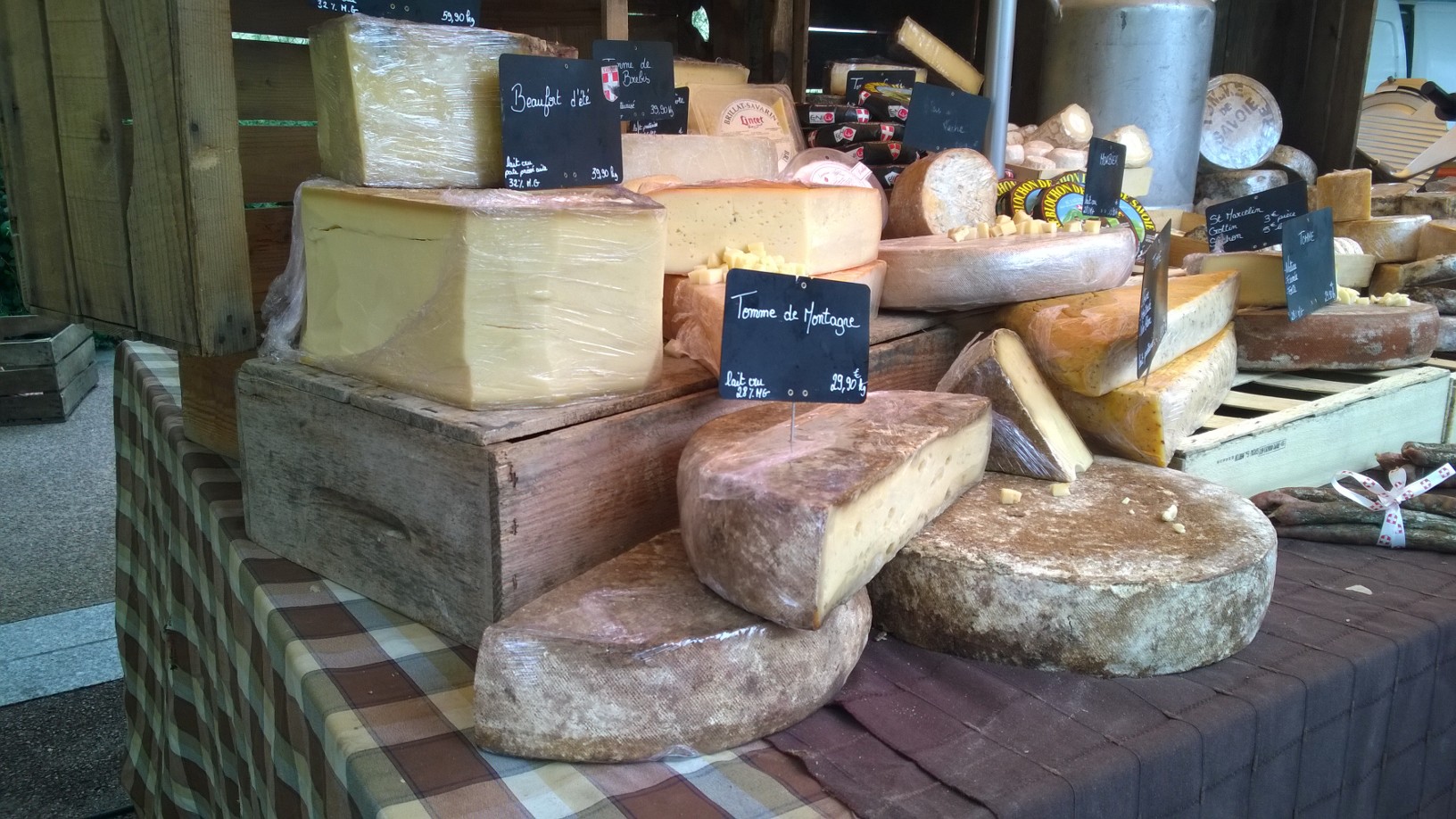 Cheese ready to sell and sample in a Swiss market (taken on phone)