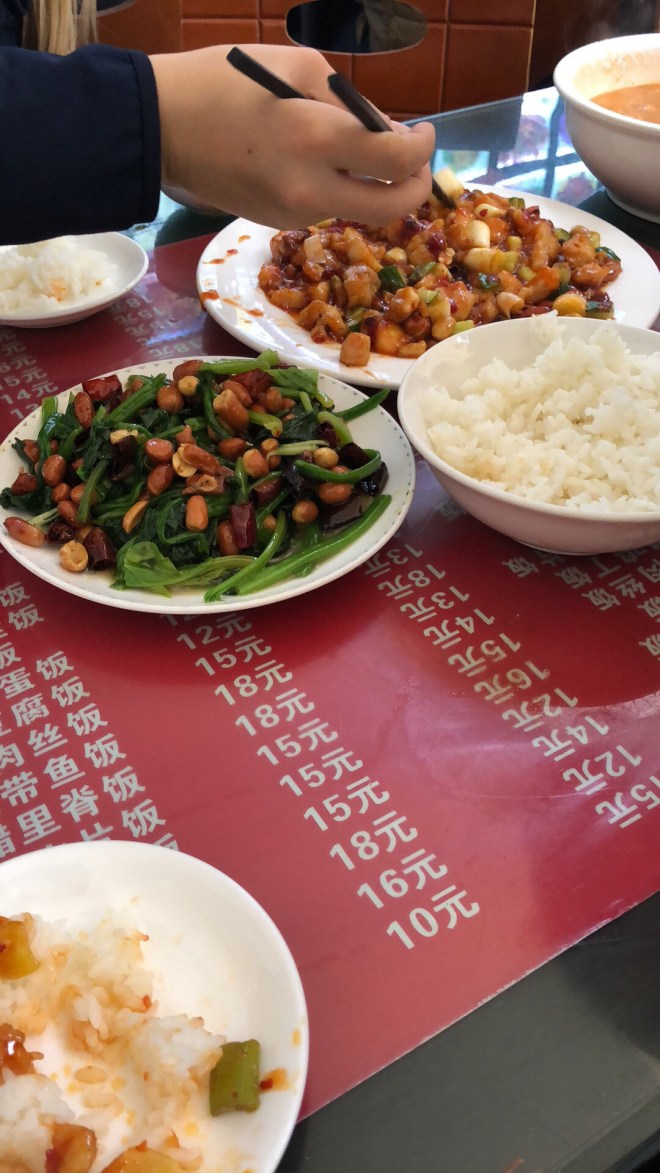 The next day, we ate a ton of great food, and also did some boring stuff. Let’s talk food first. So it’s true that in Asian cultures you get like a big plate of food and everyone shares it’s like (INSERT AMERICAN RESTAURANT THAT HAS SHARING PORTIONS HERE). In one breakfast, we had: dumplings, red bean oatmeal, noodles, cucumbers, and soy milk. Then for lunch we had this plate of chicken, some spinach, peanuts, a pepper dish, and a soup.